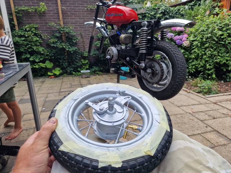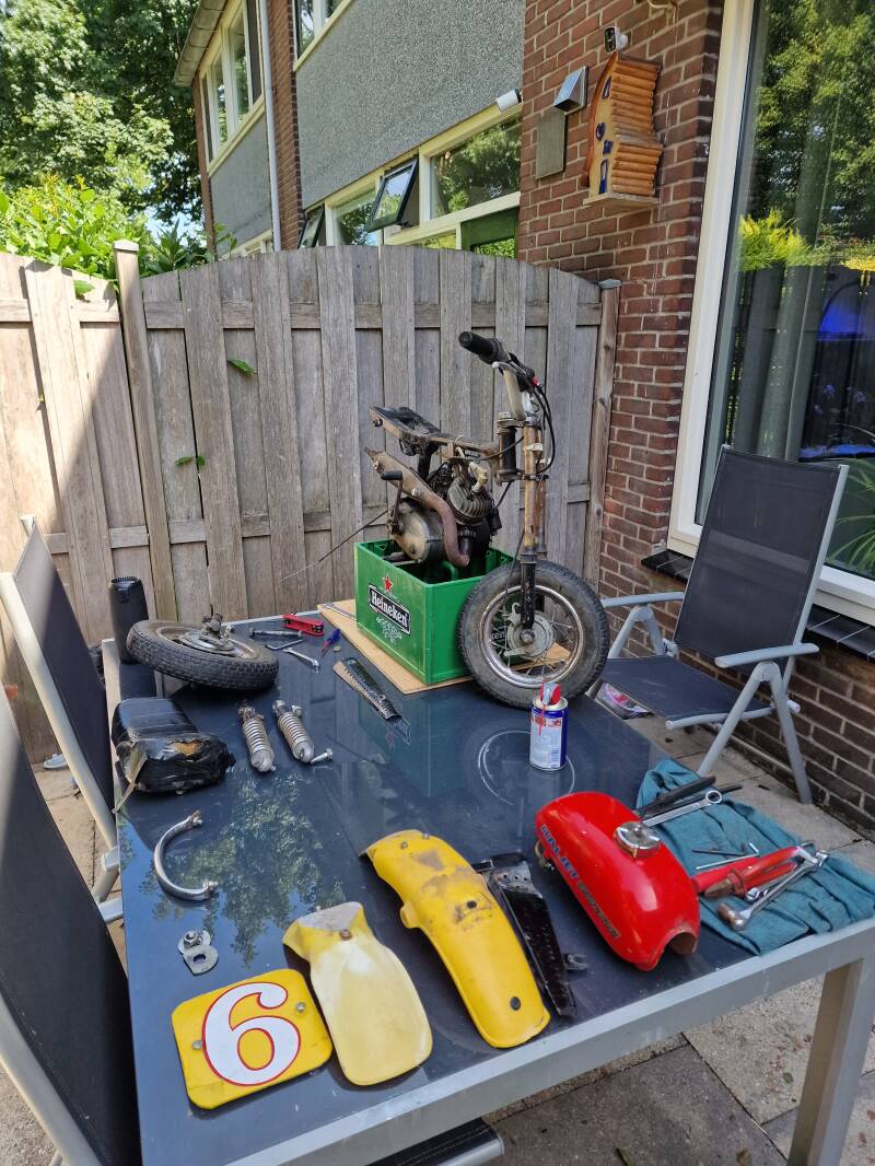 Deze heb ik geel oranje gespoten met een zwart frame. Met o.a. nieuw zuiger.