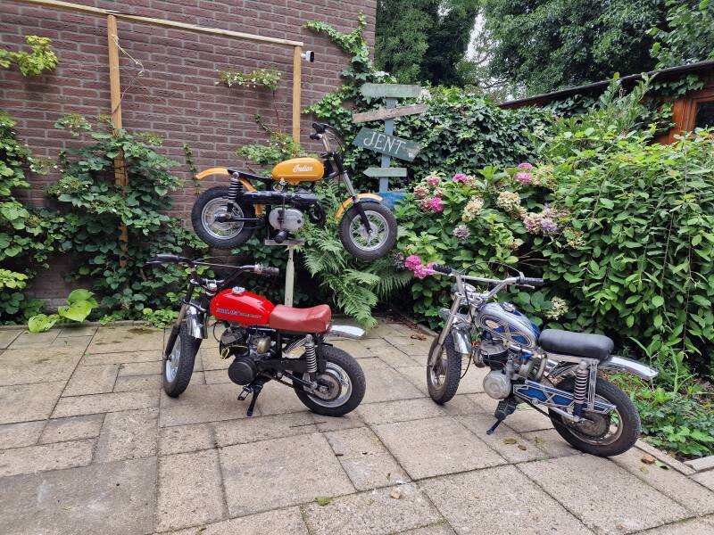 Vroeger, een jaar of 55 geleden (ca.1970) heeft mijn vader een Indian / Italjet mini bike voor ons gekocht. Op deze brommer hebben we vanaf 3 tot een jaar of 11 gereden. Dat kon toen nog gewoon op de stoep of op een industrieterrein. De eerste jaar met zijwieltjes, daarna zonder. Afgelopen zomer was ik benieuwd of er nog zulk gelijke brommertjes te koop waren. Ze zijn erg zeldzaam maar ik heb er een paar kunnen kopen via markplaats België. Een van een aardige man waarvan zijn kinderen er vroeger ook op hadden gereden. Deze brommer een eerste uitgave (V1 uit 1969/70) heb ik in de meivakantie opgeknapt. Dat smaakte naar meer en na wat zoeken op internet had ik mazzel en heb ik er weer 2 gevonden (ook in België). Deze brommertjes heb ik in de zomervakantie volledig gerestaureerd. Zuigers vervangen en alles opnieuw gespoten. Erg leuk om te doen en mijn jongste zoon van 5 rijdt er nu regelmatig op en kan ze zo ook afwisselen. Hier wat foto s van de restauratie.